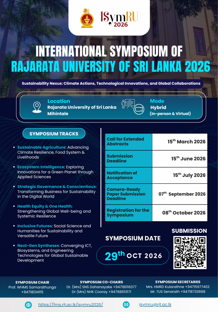 We are pleased to announce the International Symposium of Rajarata University of Sri Lanka (ISymRU 2026), organized by Rajarata University of Sri Lanka, scheduled for 29th October 2026 in Mihintale, Sri Lanka.